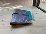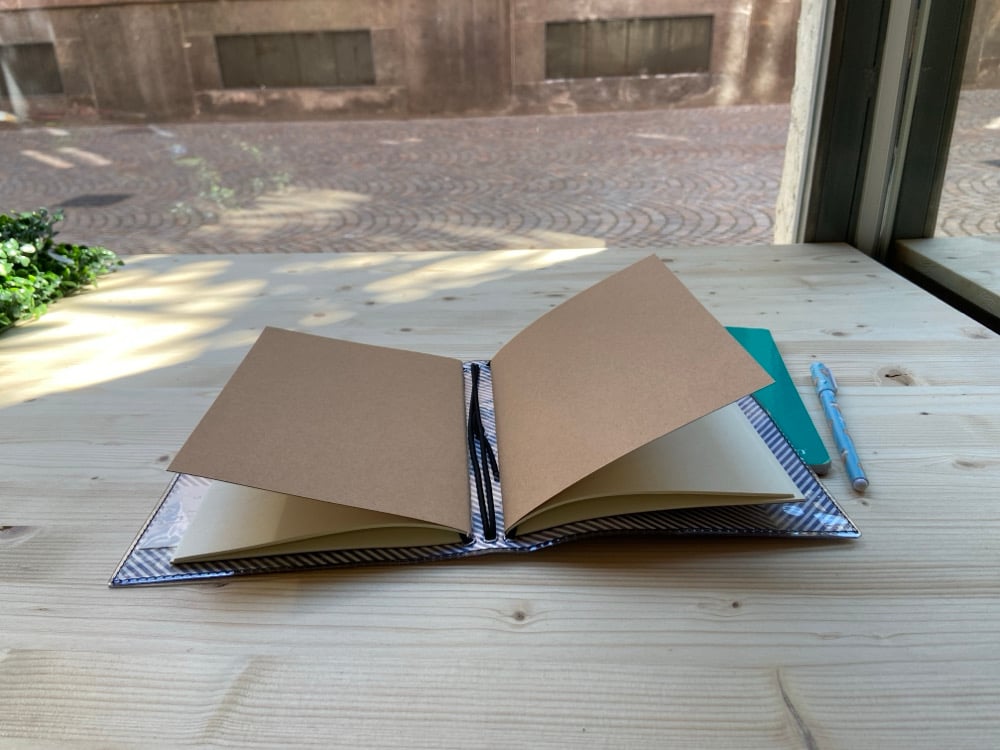 Copertina creata con cartoncino fantasia, ricoperta di pvc trasparente molto resistente e cucito insieme con una macchina per teloni. Nella contro-copertina una tasca a soffietto e una chiusa su tre lati danno la possibilità di conservare biglietti, fogli, stickers e tutto il necessario per abbellire i tuoi inserti.
