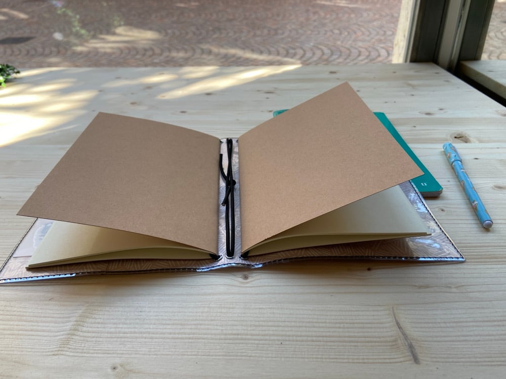 Copertina creata con cartoncino fantasia, ricoperta di pvc trasparente molto resistente e cucito insieme con una macchina per teloni. Nella contro-copertina una tasca a soffietto e una chiusa su tre lati danno la possibilità di conservare biglietti, fogli, stickers e tutto il necessario per abbellire i tuoi inserti.