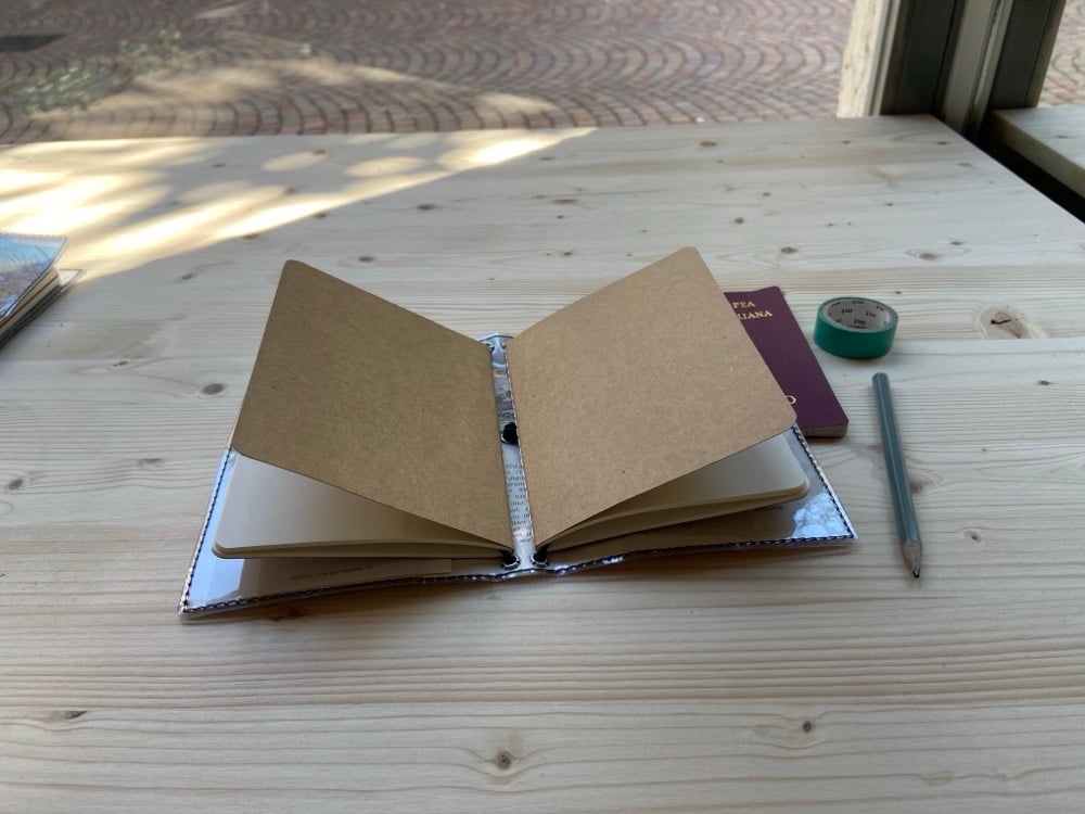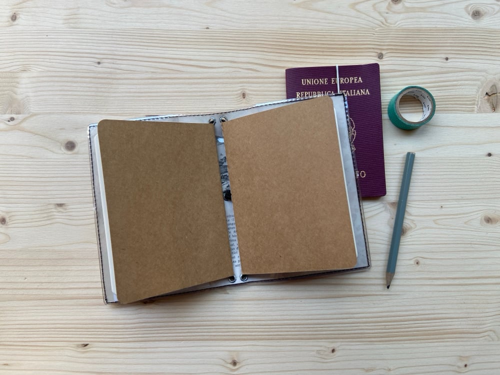Se si inseriscono inserti da viaggio come tasche trasparenti per documenti e tessere il midori diventa un traveler's notebook, un diario del viaggiatore, dove scrivere i tuoi appunti, conservare ricordi, idee e biglietti vari collezionati durante il viaggio.
