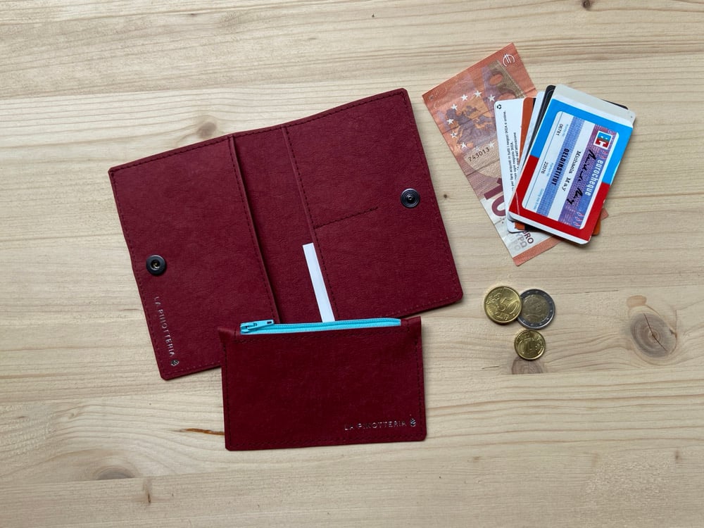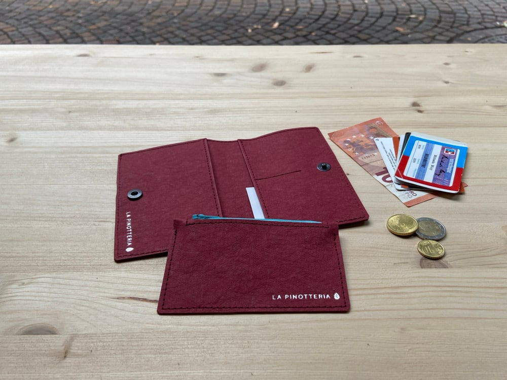 Il modello si apre a libro e ha una disposizione classica, quindi una tasca a cui si accede da sopra, adatta a contenere banconote e documenti vecchio stile. Nelle due tasche ai lati trovano spazio 8/10 tessere in due spazi più piccoli, mentre l’altra tasca contiene i documenti grandi (può contenere anche il passaporto) e un portamonete piatto che a piacimento si può estrarre. Quest’ultimo particolare questo che ha sempre caratterizzato i modelli de La Pinotteria. Il portafogli si chiude attraverso un bottone automatico inserito all’interno.