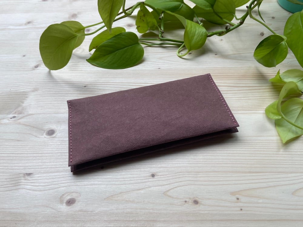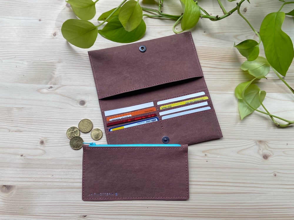 Realizzato con carta lavabile effetto pelle e cucito con filo riciclato. A seconda della carta lavabile utilizzata l’articolo può essere più o meno rigido e/o presentare pieghe, anche questo particolare lo rende unico.