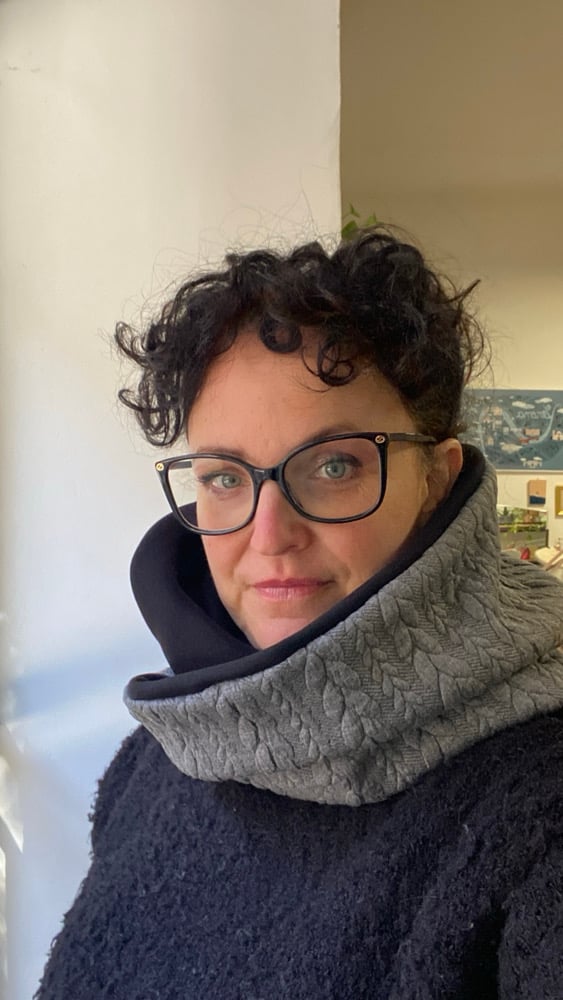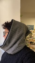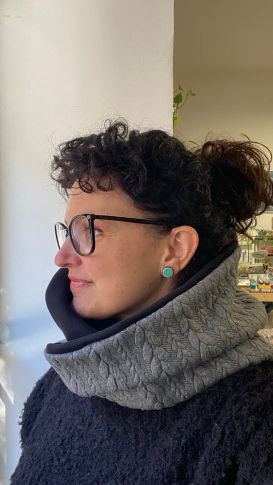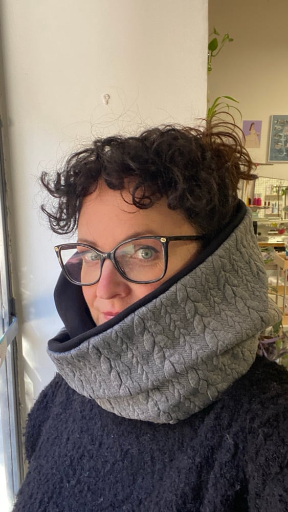Sciarpa circolare a cappuccio, realizzata con due materiali abbinati (felpa all'interno e all’esterno). Un bottone fa sì che si possa chiudere a cappuccio e utilizzare più accollata, sopra o sotto la giacca. Perfetta per le mezze stagioni ma anche per i climi più freddi, a seconda di come la utilizzi.