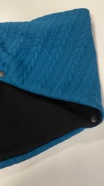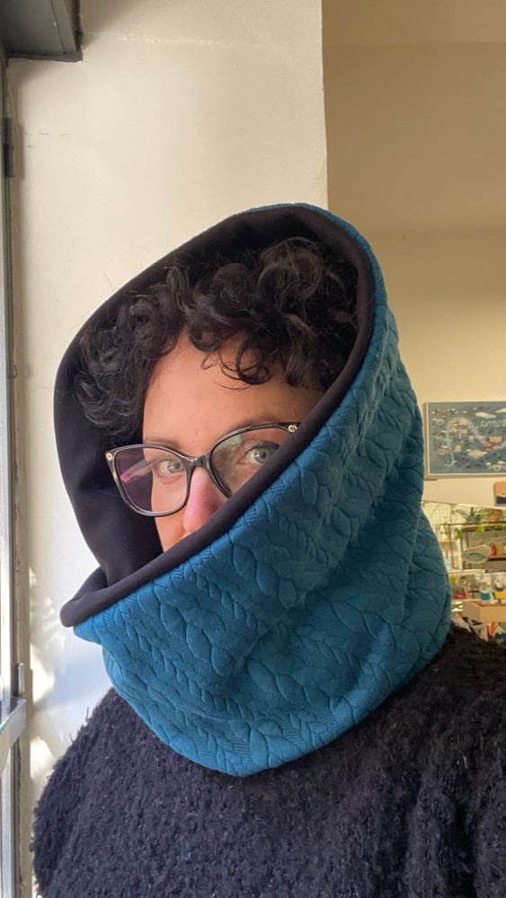 Sciarpa circolare a cappuccio, realizzata con due materiali abbinati (felpa all'interno e all’esterno). Un bottone fa sì che si possa chiudere a cappuccio e utilizzare più accollata, sopra o sotto la giacca. Perfetta per le mezze stagioni ma anche per i climi più freddi, a seconda di come la utilizzi.