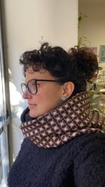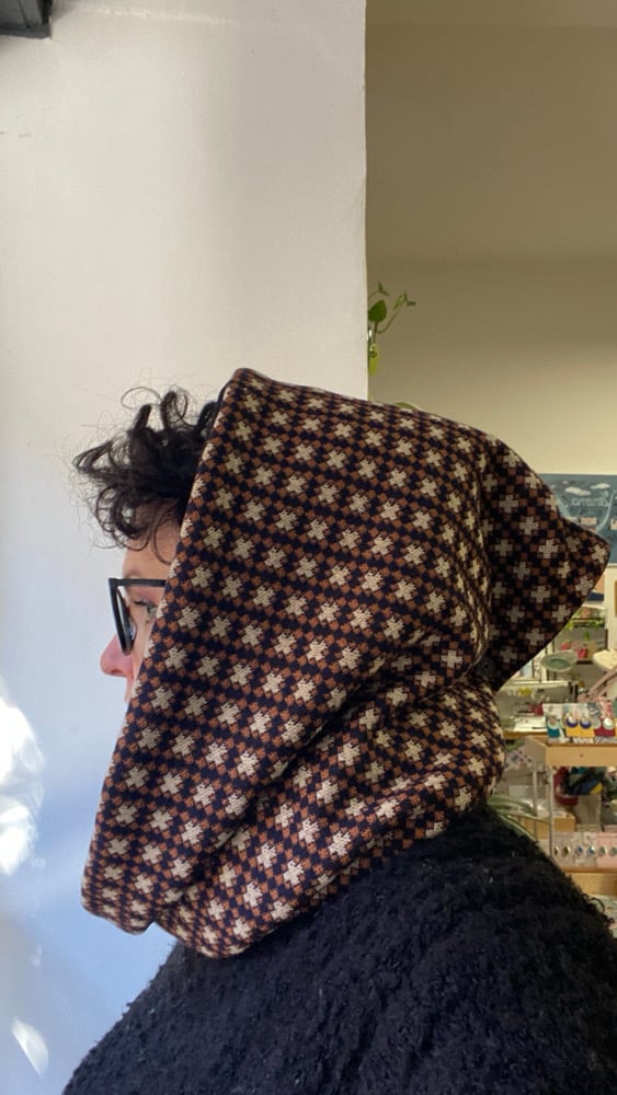 Sciarpa circolare a cappuccio, realizzata con due materiali abbinati (felpa all'interno e all’esterno). Un bottone fa sì che si possa chiudere a cappuccio e utilizzare più accollata, sopra o sotto la giacca. Perfetta per le mezze stagioni ma anche per i climi più freddi, a seconda di come la utilizzi.